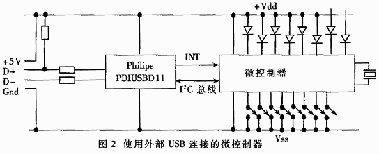 图2为使用外部USB连接的微控制器示意图,通用微控制器选用MCS-51,USB外围芯片是Philips的PDIUSBD11,该芯片带有I2C接口,其SIE接口包括一个中断和一个较大寄存器,用于对I2C总线的存取。当一个数据包来到时,PDIUSBD11将其中断线拉低,微控制器转和中断处理程序,首先读取PDIUSBD11的中断状态寄存器,然后再读取其他寄存器的值,以获得数据包类型和包中数据。每次传送完一个数据包均会产生一次中断请求,中断处理程序监视控制序列并检测所有错误。